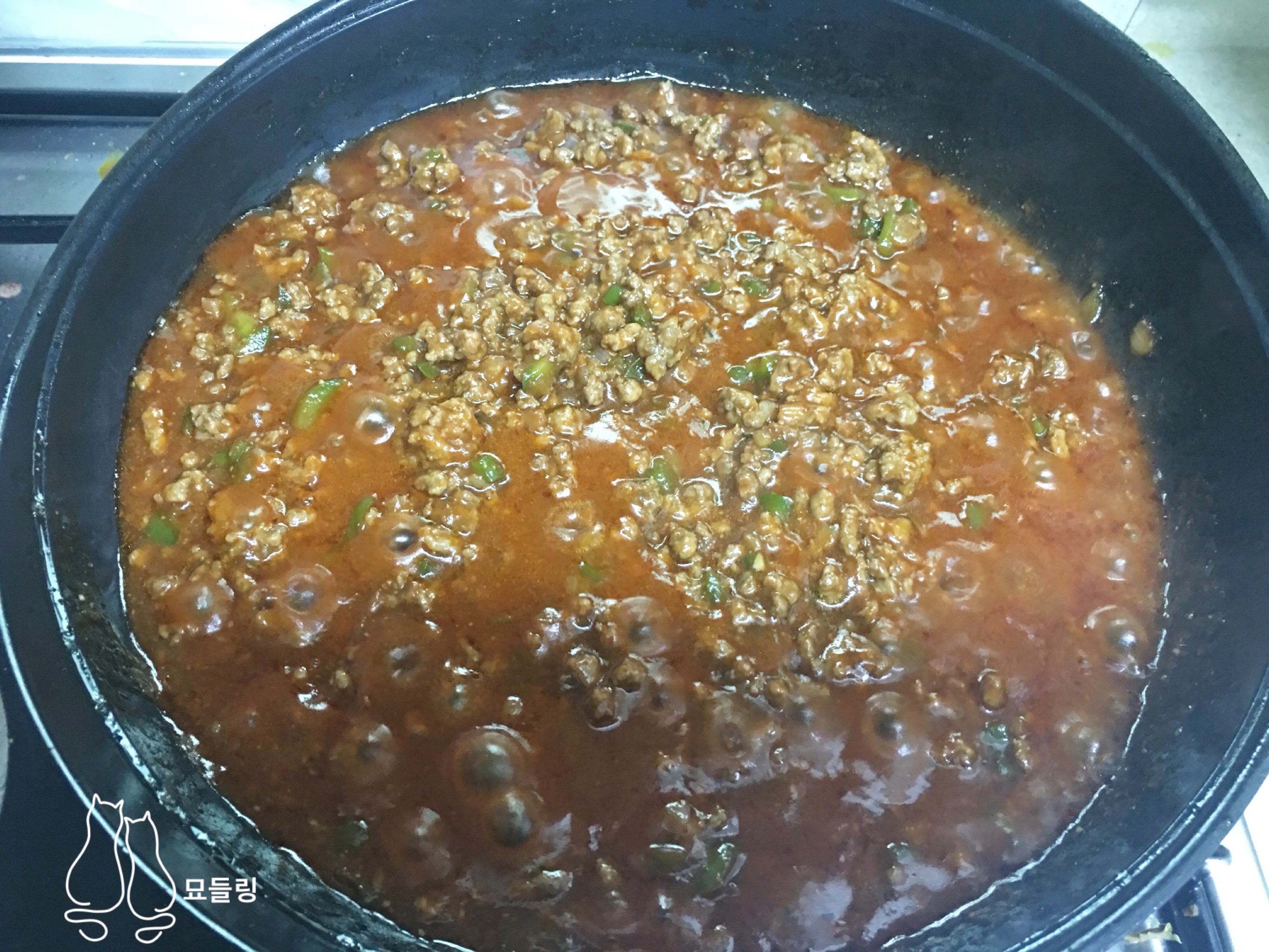 1. 팬이나 냄비에 간 소고기를 넣고 다 부서지도록 잘 펴가며 골고루 익혀주세요.
