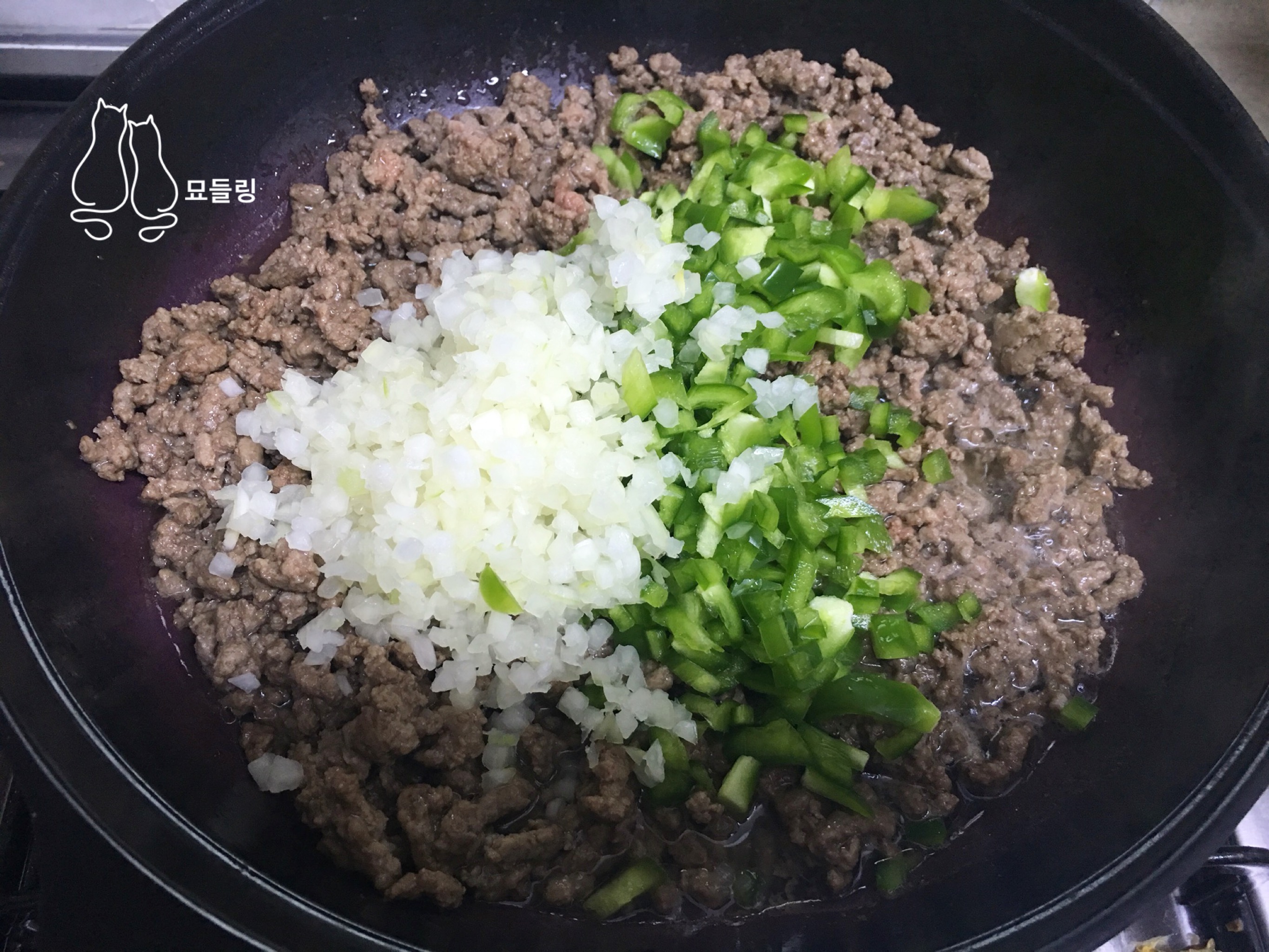 2. 고기가 다 익고 나면 양파와 피망을 넣고 좀 더 익혀주세요