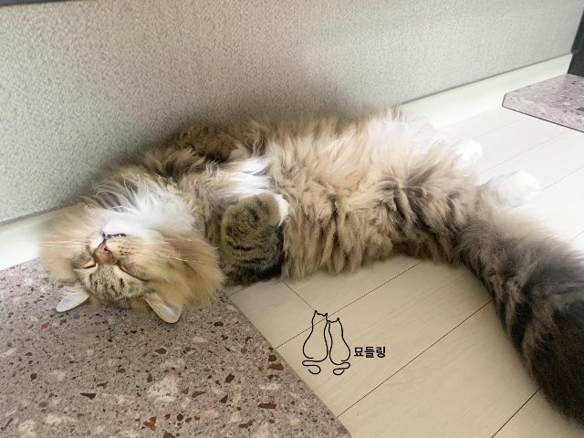 2. 표면이 시원한 장소를 찾아가요. 고양이가 괜히 화장실 바닥이나 빨래방 또는 대리석이 있는 곳을 좋아하는 것이 아니에요. 바닥이 시원하면 체온이 떨어진다는 사실을 너무 잘 알고 있답니다. 그래서 요즘에는 고양이들이 시원하게 쉴 수 있는 대리석 침대들이 시중이 많이 판매되고 있죠. 저희 아이들도 폭신한 이불이나 카펫에서 잠을 자곤 했는데 요즘은 대리석이나 그냥 방바닥에 퍼져서 잠을 자요 ㅋㅋ 특히 태피는 부엌 싱크대 옆 대리석 카운터 위해서 늘어져 있는 걸 좋아해요. 설거지를 할 때도 시원하게 물소리 들으면서 옆에서 잠을 자곤 합니다.