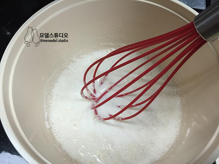 2. 먼저 덩어리가 다 없어질 때까지 잘 저어서 풀어주시고 난 후에 중불에서 계속 저어 가면서 가열해주시면 됩니다. 그리고 계속 젓다가 약간 걸쭉해지면 약불로 줄여주세요.