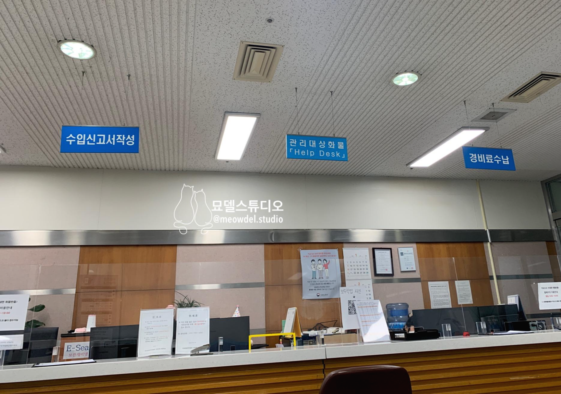 위의 주소라 가셔서 서류를 직원에게 주면 알아서 검토하고 신고까지 해줍니다. 대행 수수료 13,000원 이체하시고 직원이 주는 서류를 받아서 바로 옆 건물로 가시면 관세와 부가세를 지불하실 수 있어요