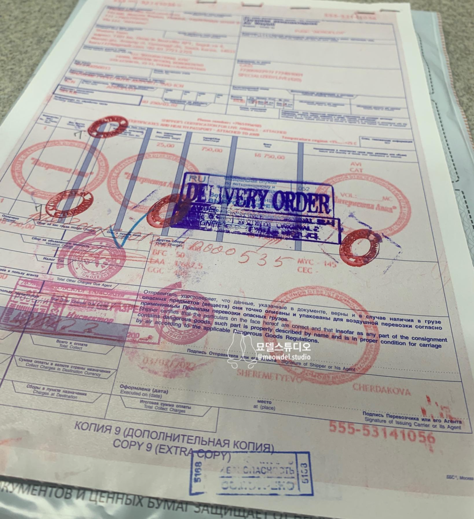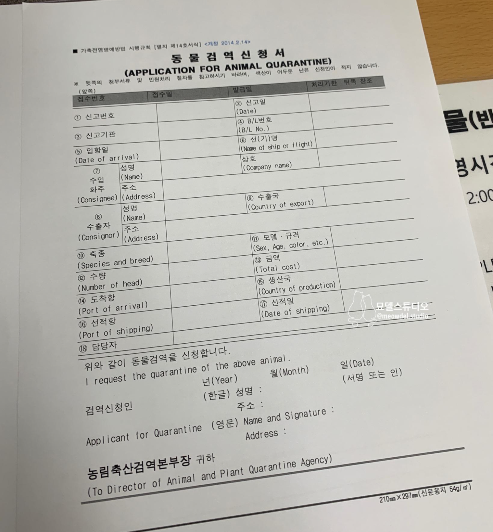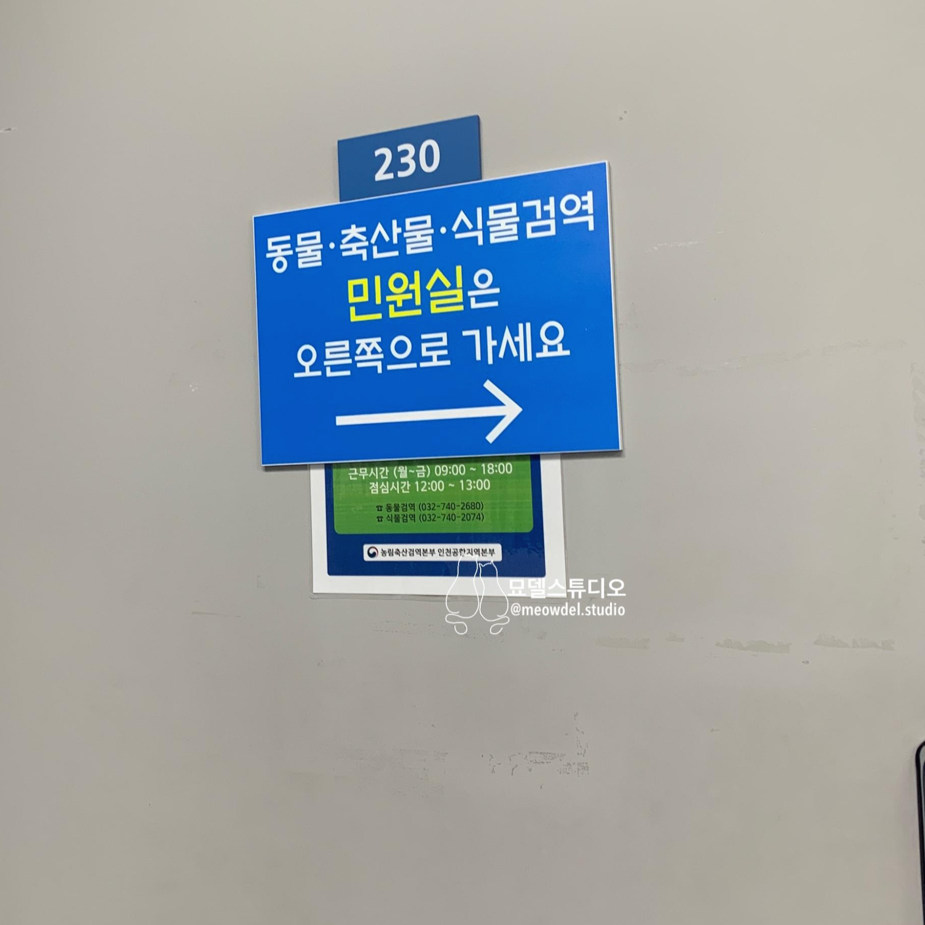 이렇게 생긴 신청서를 작성하신 후에 갖고 계신 서류 뭉치를 직원분께 드리면 필요한 것들만 꺼내 가시고 다시 돌려주십니다. 1만 원 수수료를 지불하시고 나면 직원이 직접 화물청사로 가서 고양이 확인을 해요. 보통 1-3시간 정도 걸리는 거 같아요. 확인이 다 끝나면 문자로 안내를 해준다고 하는데 제가 갔을 때는 무슨 시스템의 오류가 있었는지 문자가 오지 않았어요. 그리고 한참 뒤에 직원이 직접 전화를 했더라고요.