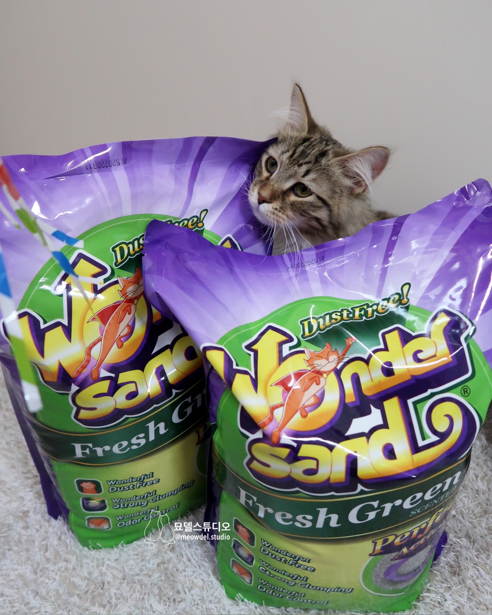 원더 샌드는 유향과 무향으로 총 4가지 종류가 있습니다. 그중에서 감사하게도 쏘피와 래피가 사용해 볼 수 있게 프레시 그린 천연 허브 향을 넉넉하게 보내주셨어요. 사실 모래는 항상 무향으로 사용을 했기 때문에 제품을 받아보기 전까지는 혹시라도 향이 너무 강하면 어떡하나 걱정을 좀 했는데, 프레시 그린은 아주 은은하고 상쾌한 향이라 기분이 좋더라고요.