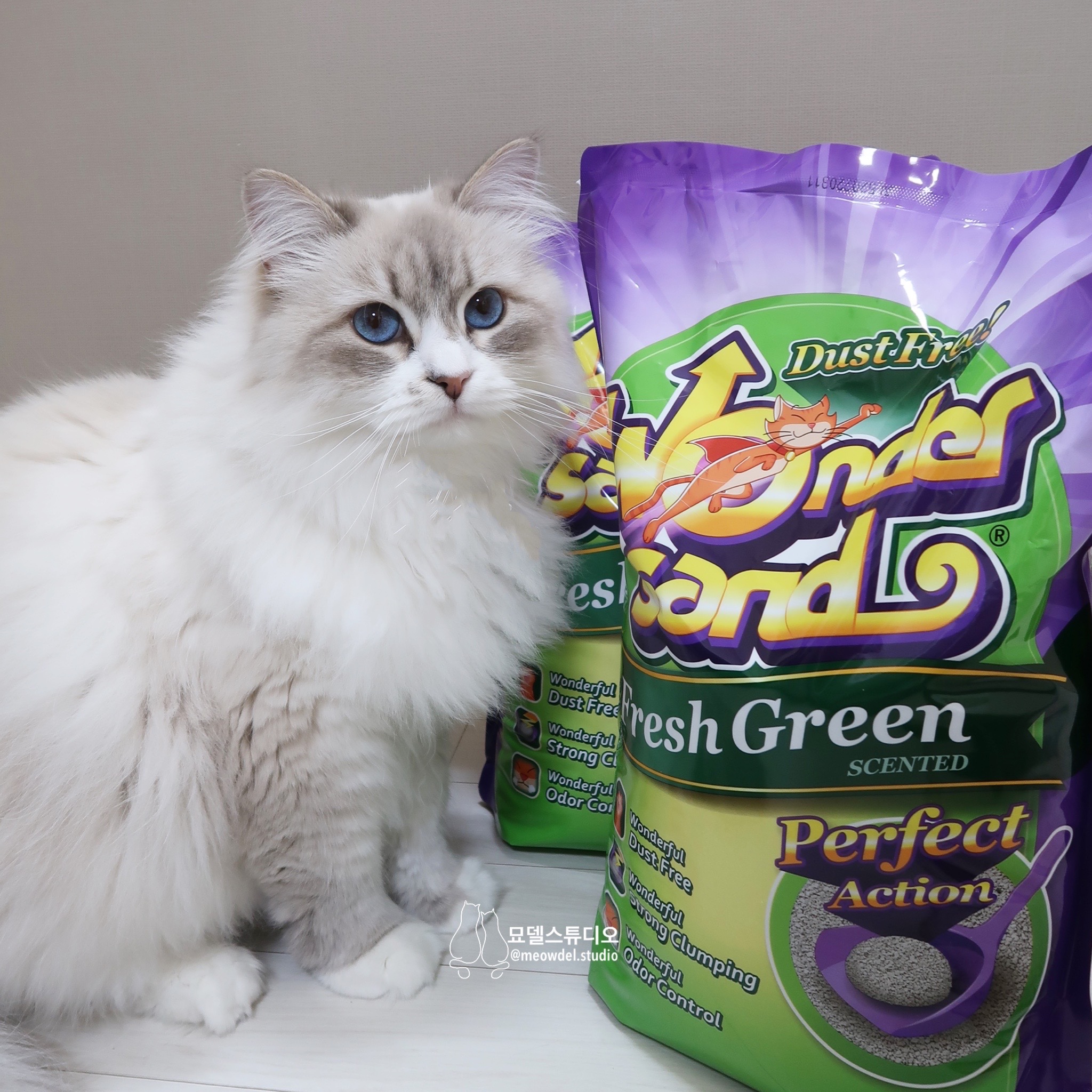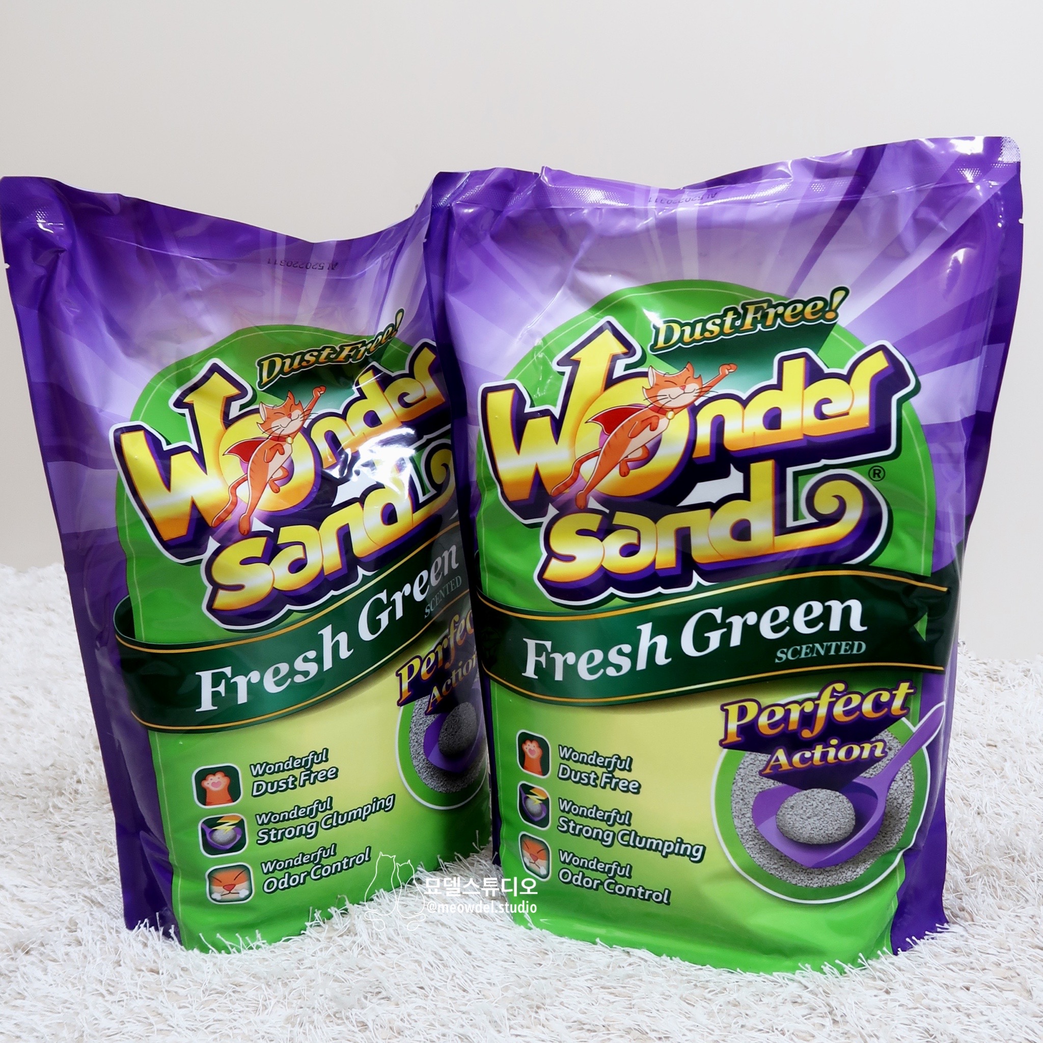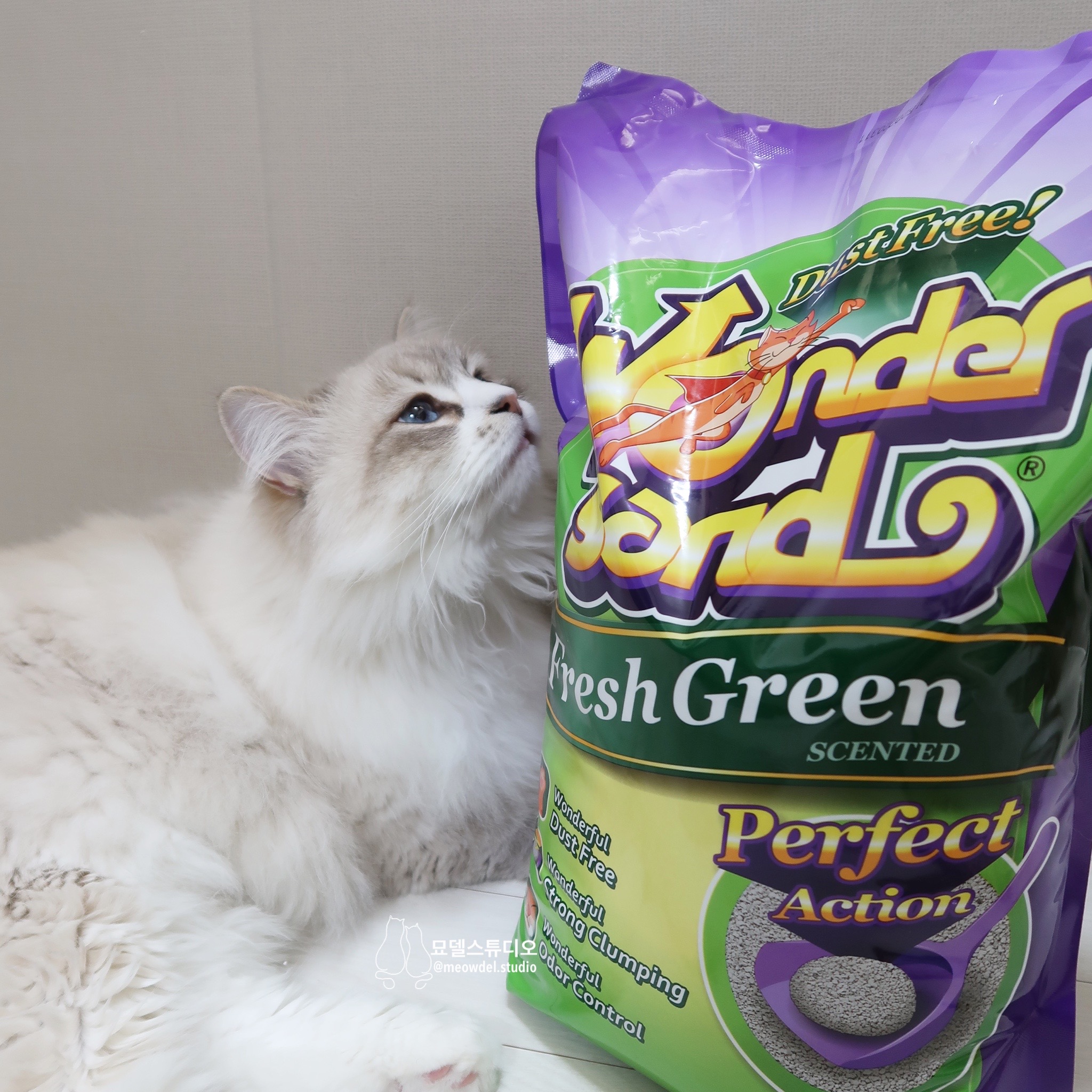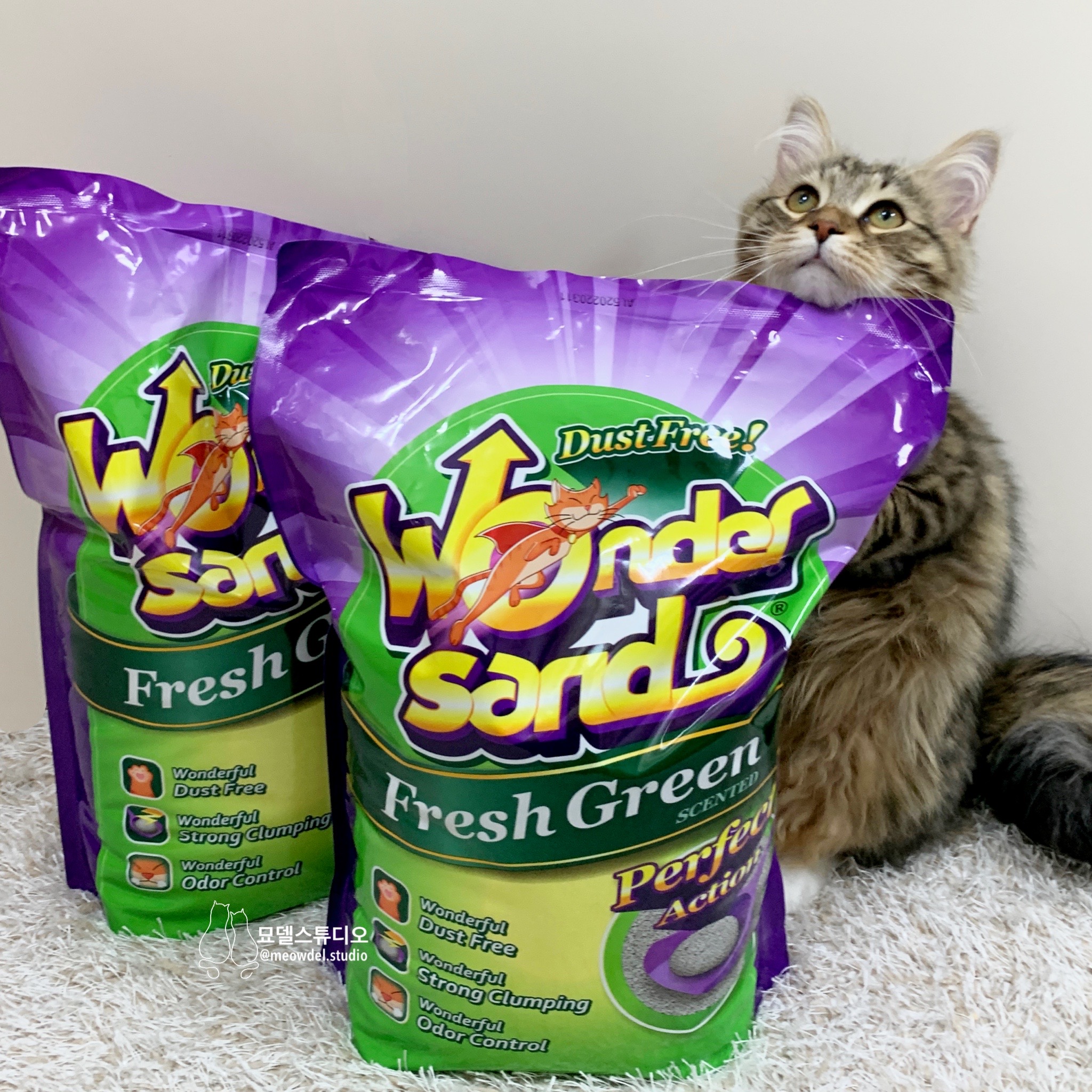 원더 샌드는 유향과 무향으로 총 4가지 종류가 있습니다. 그중에서 감사하게도 쏘피와 래피가 사용해 볼 수 있게 프레시 그린 천연 허브 향을 넉넉하게 보내주셨어요. 사실 모래는 항상 무향으로 사용을 했기 때문에 제품을 받아보기 전까지는 혹시라도 향이 너무 강하면 어떡하나 걱정을 좀 했는데, 프레시 그린은 아주 은은하고 상쾌한 향이라 기분이 좋더라고요.